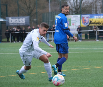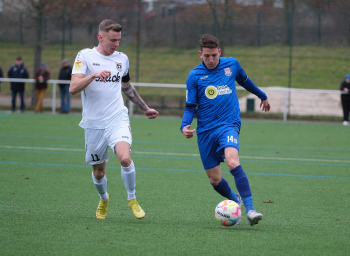 18.02.2023 xkhx Stadtallendorf Bitburger Hessenpokal 2022/2023 Viertelfinale Eintracht Stadtallendorf - FSV Frankfurt AMAR ZILDZOVIC (Eintracht Stadtallendorf) gegen AHMED AZAOUAGH (7, FSV Frankfurt) ********* Foto: Peter Hartenfelser