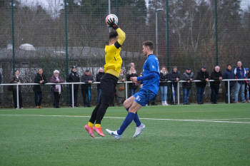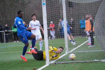 18.02.2023 xkhx Stadtallendorf Bitburger Hessenpokal 2022/2023 Viertelfinale Eintracht Stadtallendorf - FSV Frankfurt Torwart Tolga Sahin (Eintracht Stadtallendorf) gegen JAKE HIRST (18, FSV Frankfurt) ********* Foto: Peter Hartenfelser