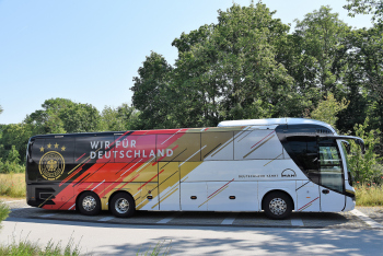 10.06.2023 Frankfurt am Main, DFB-Campus DFB Training der Deutschen Nationalmannschaft Teambus der Deutschen Nationalmannschaft mit dem Slogan - Wir für Deutschland ********* Foto: Peter Hartenfelser