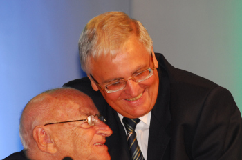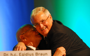 Au?erordentlicher DFB-Bundestag, Pr?sident Theo Zwanziger umarmt Egidius Braun Bild ist Honorarpflichtig, auf Anfrage in h?herer Qualit?t Quellenangabe: A2/Hartenfelser