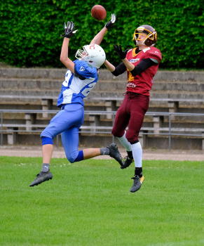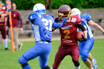 27.05.2019 xkhx Kassel American Football Kassel Titans gegen Rüsselsheim Crusaders #2 Felix Rehm II (Rüsselsheim Crusaders) gegen #29 Till Orth (Kassel Titans)