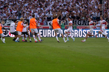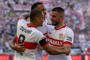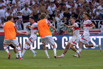 Torjubel des Torschützen Fabian Rieder (VfB Stuttgart), Jubel und Freude bei Nick Woltemade, Maximilian Mittelstädt und Atakan Karazor (VfB Stuttgart)