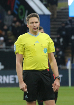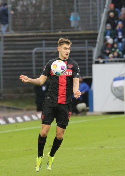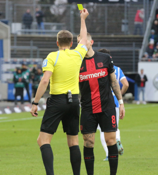 am Boden Fabian Holland (32, SV98), Schiedsrichter Tobias Reichel, Robert Andrich ( 8, Bayer Leverkusen)
