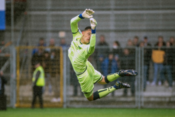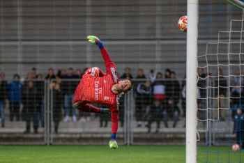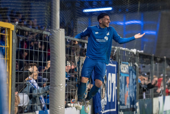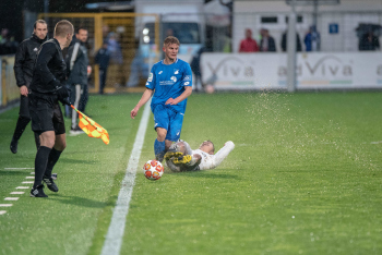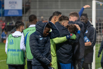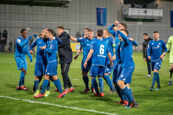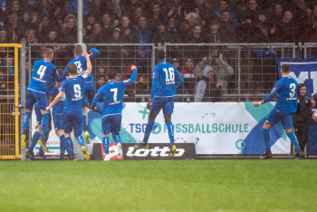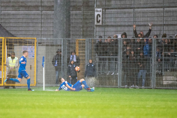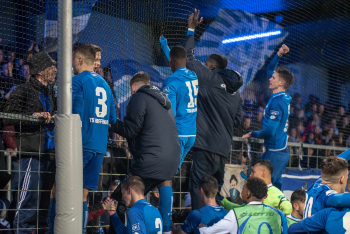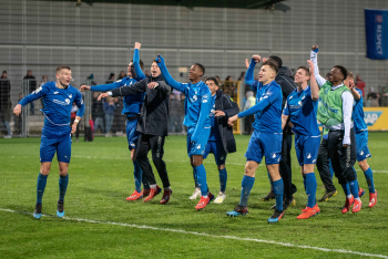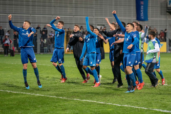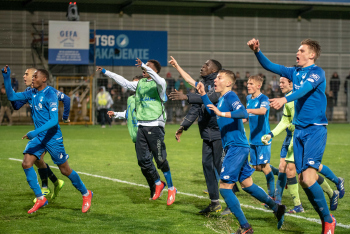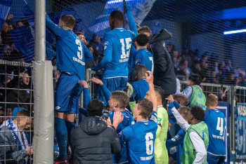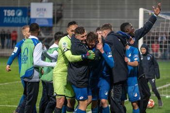Luis Görlich (TSG 1899 Hoffenheim U19), Melayro Bogarde (TSG 1899 Hoffenheim U19), Domenico Alberico (TSG 1899 Hoffenheim U19), Samuel Lengle (TSG 1899 Hoffenheim U19), Benjamin Wallquist (TSG 1899 Hoffenheim U19) feiern auf dem Zaun mit Ihren Fans.