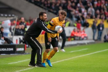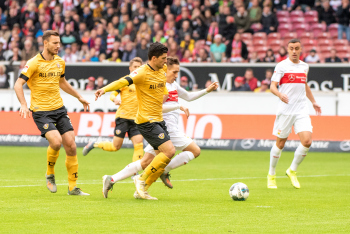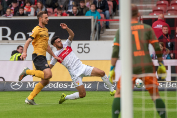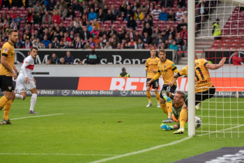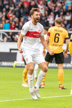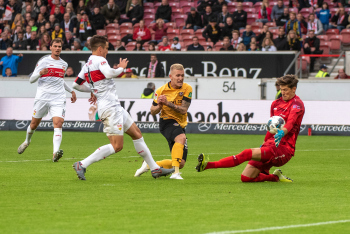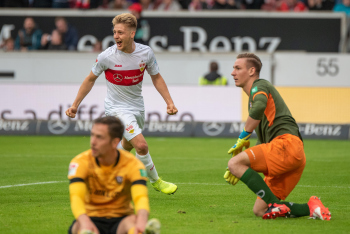 Torjubel des Torschützen Santiago Ascacibar (VfB Stuttgart), Jubel und Freude bei Nicolas Gonzalez (VfB Stuttgart), Torwart Kevin Broll (Dynamo Dresden) enttäuscht.