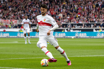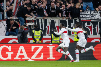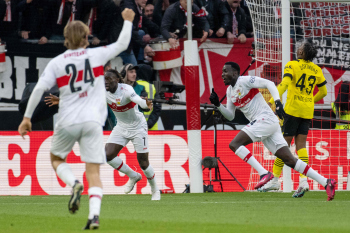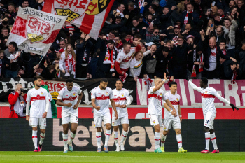 Stuttgarter Torjubel nach dem Ausgleich, v.l. Atakan Karazor, Dan-Axel Zagadou, Torschütze Josha Vagnoman, Tiago Barreiros de Melo Tomas, Waldemar Anton, Wataru Endo und Silas Katompa Mvumpa (VfB Stuttgart).