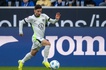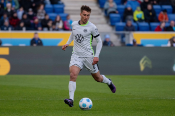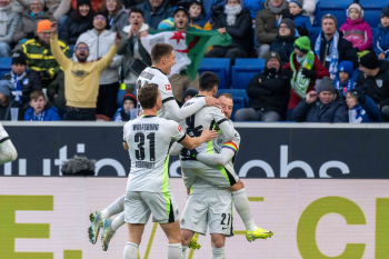 Wolfsburger Torjubel, v.l. Yannick Gerhardt, Bence Dardai, Torschütze Mohammed Amoura und Assist Maximilian Arnold (VfL Wolfsburg).