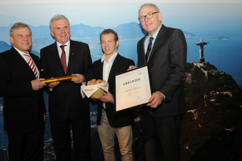 Axel Achten (Gesch?ftsf?hrer der Deutschen Sport Marketing), backaldrin-Eigent?mer Peter Augendopler, Turner Fabian Hamb?chen und den DOSB-Vorstandsvorsitzenden Michael Vesper (v.l.)