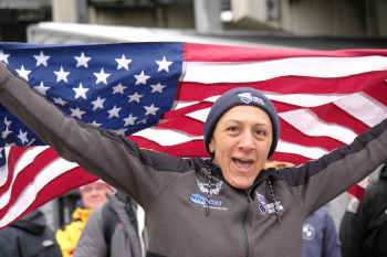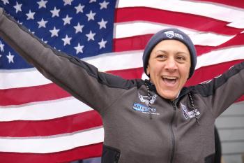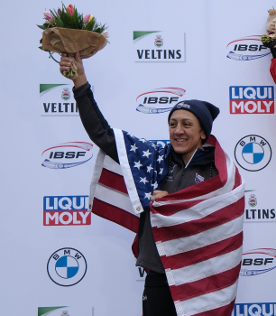 25.02.2024 xkhx Winterberg, VELTINS-EisArena IBSF BMW Bob Weltmeisterschaft Winterberg, Finale Monobob Damen Jubel bei Elana Meyers Taylor (USA),