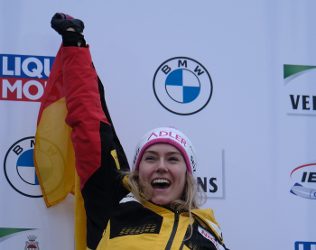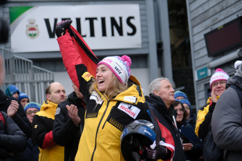 25.02.2024 xkhx Winterberg, VELTINS-EisArena IBSF BMW Bob Weltmeisterschaft Winterberg, Finale Monobob Damen Jubel bei Weltmisterin , Laura Nolte (Deutschland),