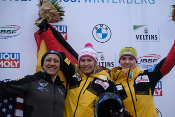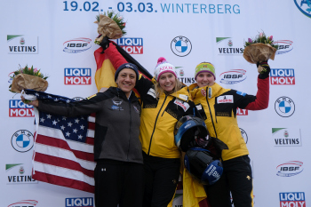 25.02.2024 xkhx Winterberg, VELTINS-EisArena IBSF BMW Bob Weltmeisterschaft Winterberg, Finale Monobob Damen Jubel auf dem Podium Elana Meyers Taylor (USA), Laura Nolte (Deutschland), Lisa Buckwitz (Deutschland)