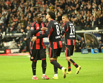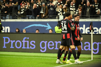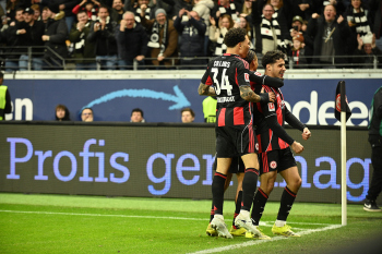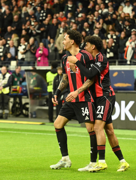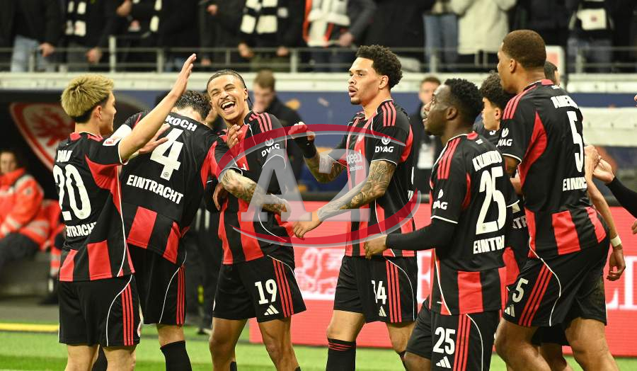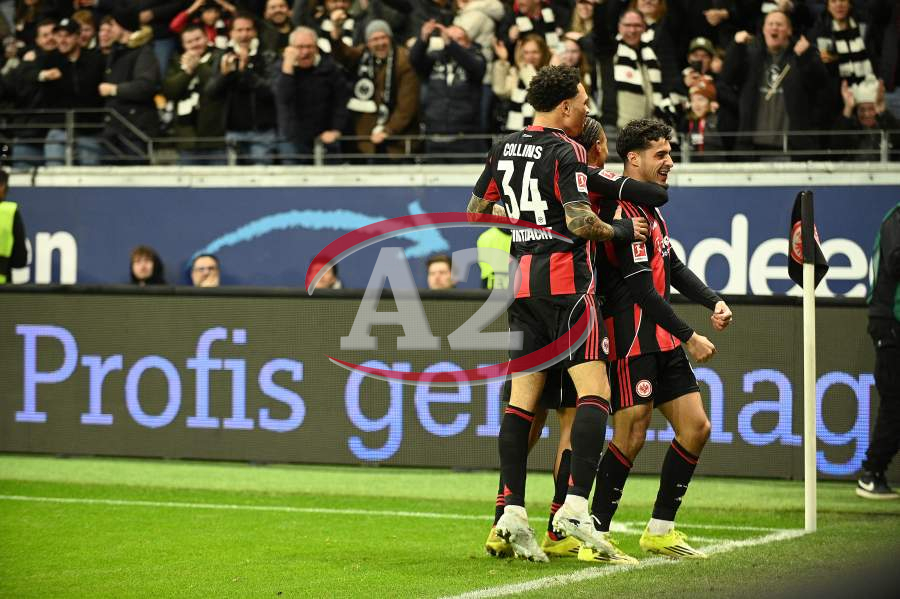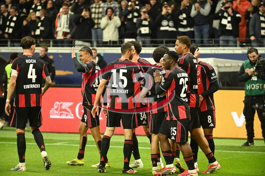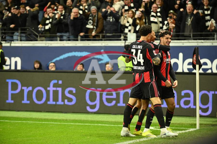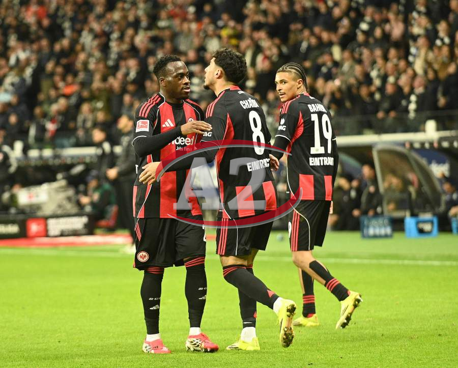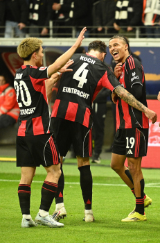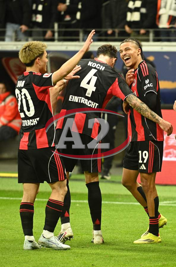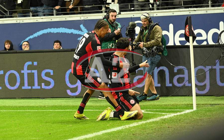 Torjubel nach dem Tor zum 1:0 durch Farès Chaïbi (8, Eintracht Frankfurt) hier Nnamdi Collins (34, Eintracht Frankfurt) und Nathaniel Brown (21, Eintracht Frankfurt)