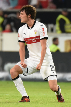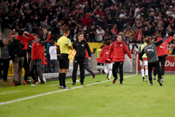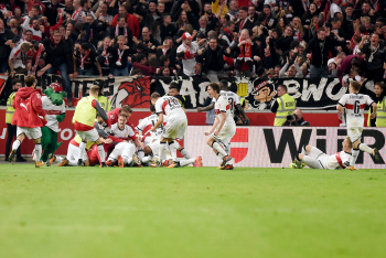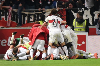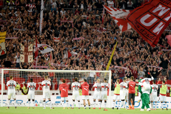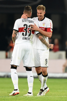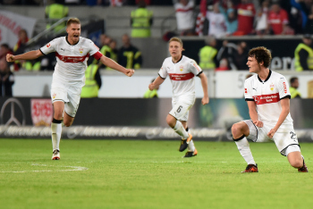 Holger Badstuber (VfB Stuttgart), Orel Mangala (VfB Stuttgart), Simon Terodde (VfB Stuttgart), Takuma Aasano (VfB Stuttgart), Benjamin Pavard (VfB Stuttgart), Andreas Beck (VfB Stuttgart), Dennis Aogo (VfB Stuttgart), Daniel Ginczek (VfB Stuttgart), Anastasios Donis (VfB Stuttgart) feiern mit Ihren Fans. Maskottchen Fritzle (VfB Stuttgart) trägt den Torschuetzen Chadrac Akolo (VfB Stuttgart) auf den Schultern .
