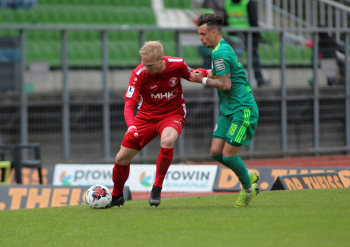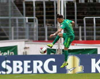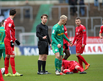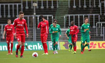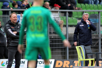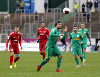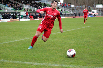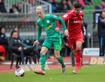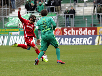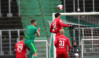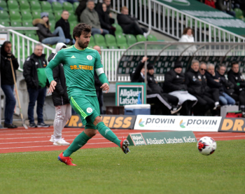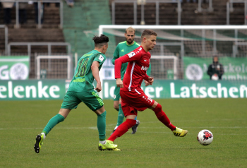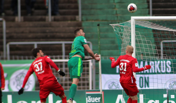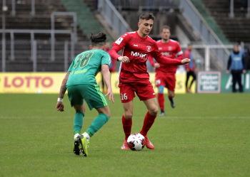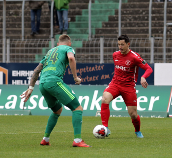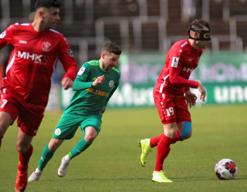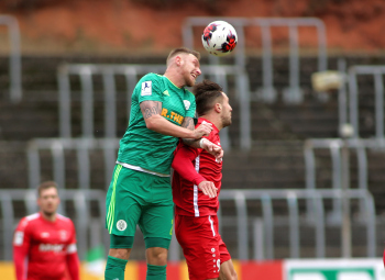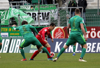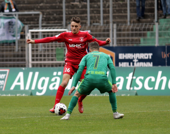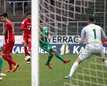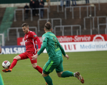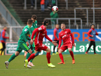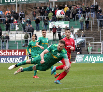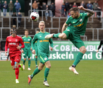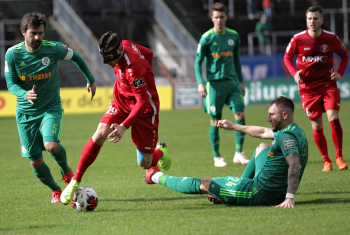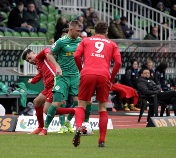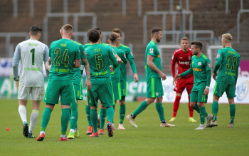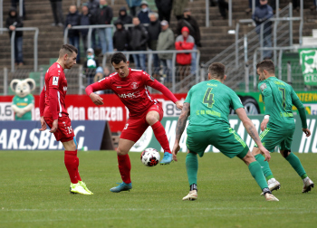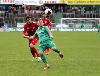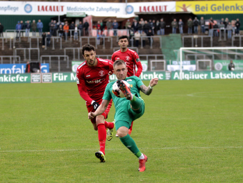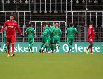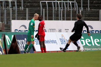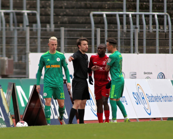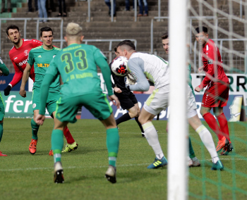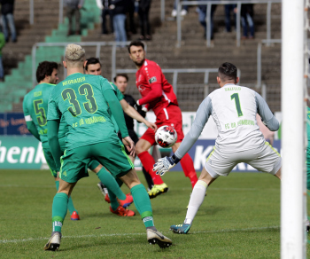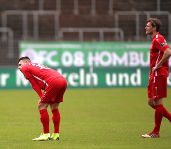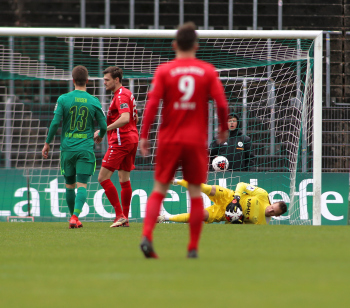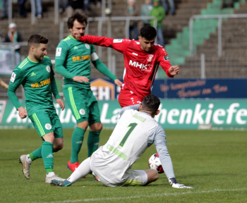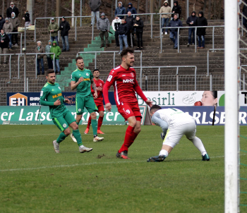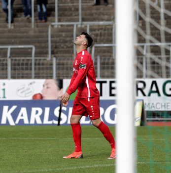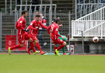 16.03..2019, xxx,Homburg, Fussball, Waldstadion-Homburg, Regionalliga Suedwest, Saison 2018/2019, FC 08 Homburg gegen SC Hessen Dreieich; Torjubel nach dem 1:0 in der 15. Minute FE. durch Alexander Hahn (FC 08 Homburg), vl: Kevin Pezzoni (SC Hessen Dreieich), Patrick Lienhard (FC 08 Homburg), (mit Faust), Alexander Hahn (FC 08 Homburg), Maurice Neubauer (FC 08 Homburg),