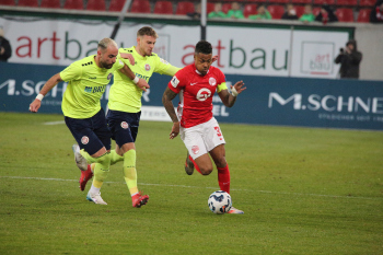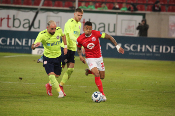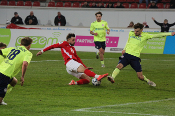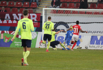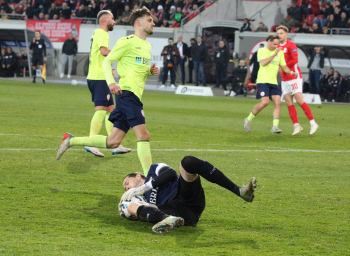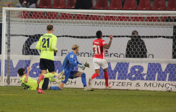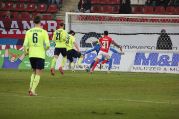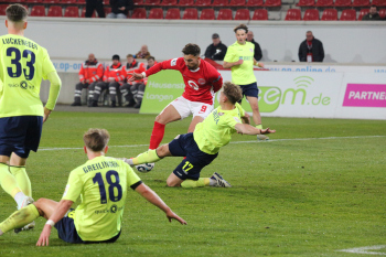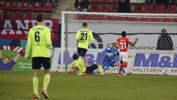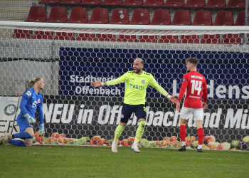 19.03.2025 xmgoodx Offenbach am Main, Sparda-Bank-Hessen Stadion - Stadion Bieberer Berg Hessenpokal Viertelfinale Kickers Offenbach (OFC) - SV Wehen Wiesbaden (SVWW) Tor zum 1:0 durch Moritz Flotho (SVWW), Torwart Torwart Lucs Becker (18, OFC) geschlagen, Ronny Marcos (31, OFC) kommt zu spät ********* Foto: A2Bildagentur