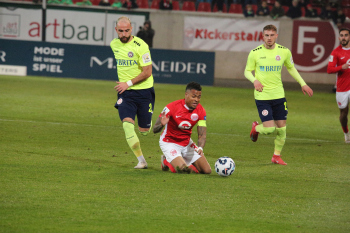 19.03.2025 xmgoodx Offenbach am Main, Sparda-Bank-Hessen Stadion - Stadion Bieberer Berg Hessenpokal Viertelfinale Kickers Offenbach (OFC) - SV Wehen Wiesbaden (SVWW) Florian Carstens (SVWW) gegen Valdrin Mustafa (9, OFC) ********* Foto: A2Bildagentur