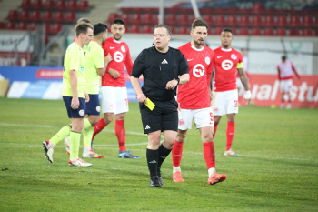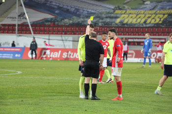 19.03.2025 xmgoodx Offenbach am Main, Sparda-Bank-Hessen Stadion - Stadion Bieberer Berg Hessenpokal Viertelfinale Kickers Offenbach (OFC) - SV Wehen Wiesbaden (SVWW) Schiedsrichter Steffen Rabe mit der Gelben Karte für Dimitrij Nazarov (10, OFC) ********* Foto: A2Bildagentur