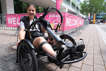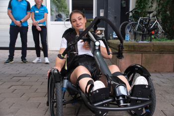 Seit 2018 querschnittsgelähmt, steigt Kristina Vogel erstmals wieder aufs Rad: das Handbike „Hands-On-Cycle“ von HP Velotechnik
