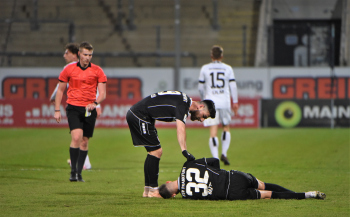 23.03.2021 Frankfurt, Fussball, PSD Arena, Regionalliga Suedwest, Saison 2020/2021, FSV Frankfurt - SSV Ulm Schiedsrichter Jona Brombacher - Luca Bazzoli (32, FSV Frankfurt) verletzt *** Foto: Peter Hartenfelser
