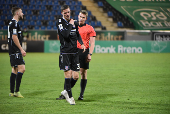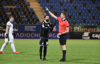 23.03.2021 Frankfurt, Fussball, PSD Arena, Regionalliga Suedwest, Saison 2020/2021, FSV Frankfurt - SSV Ulm Schiedsrichter Jonas Brombacher Denis Mangafic (30, FSV Frankfurt) *** Foto: Peter Hartenfelser