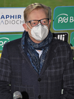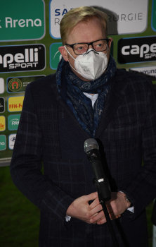 23.03.2021 Frankfurt, Fussball, PSD Arena, Regionalliga Suedwest, Saison 2020/2021, FSV Frankfurt - SSV Ulm Frankfurts Stadtrat Markus Frank vorbildlich mit medizinischer Maske *** Foto: Peter Hartenfelser