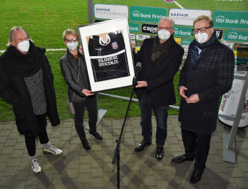 23.03.2021 Frankfurt, Fussball, PSD Arena, Regionalliga Suedwest, Saison 2020/2021, FSV Frankfurt - SSV Ulm im Rahmen der Internationalen Wochen gegen Rassismus 2021„Solidarität. Grenzenlos das FSV Frankfurt Sondertrikot für den guten Zweck FSV Frankfurt Präsident Michael Görner Geschäftsführerin Sportparkstadion Frankfurt Clarissa Böckl , Stadtrat Claus Möbius und Stadtrat Markus Frank alle vorbildlich mit medizinischer Maske *** Foto: Peter Hartenfelser