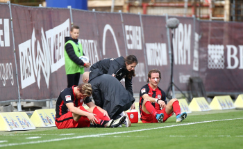 Marcel Titsch-Rivero (SVWW) und Stefan Aigner (SVWW) muessen nach einem Zusammenprall behandelt werden, Behandlung, Verletzung, verletzt, Auswechslung