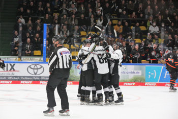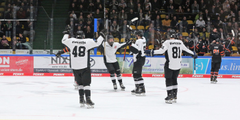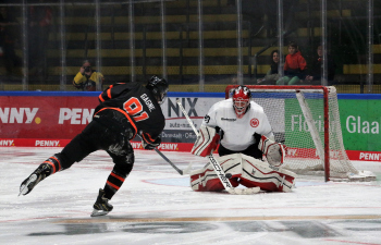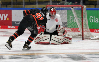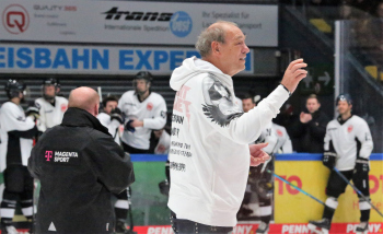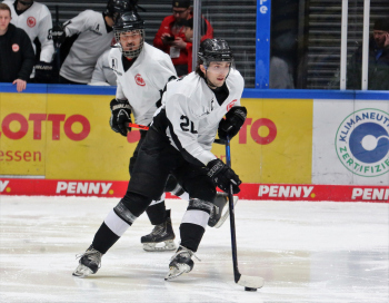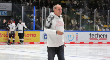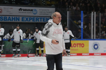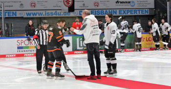 Eintracht Frankfurts Präsident Peter Fischer wagt sich aufs Eis und gibt den Puck zum Anstoss frei