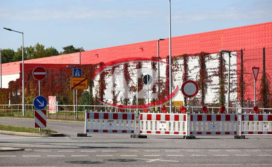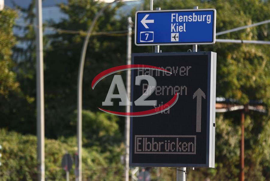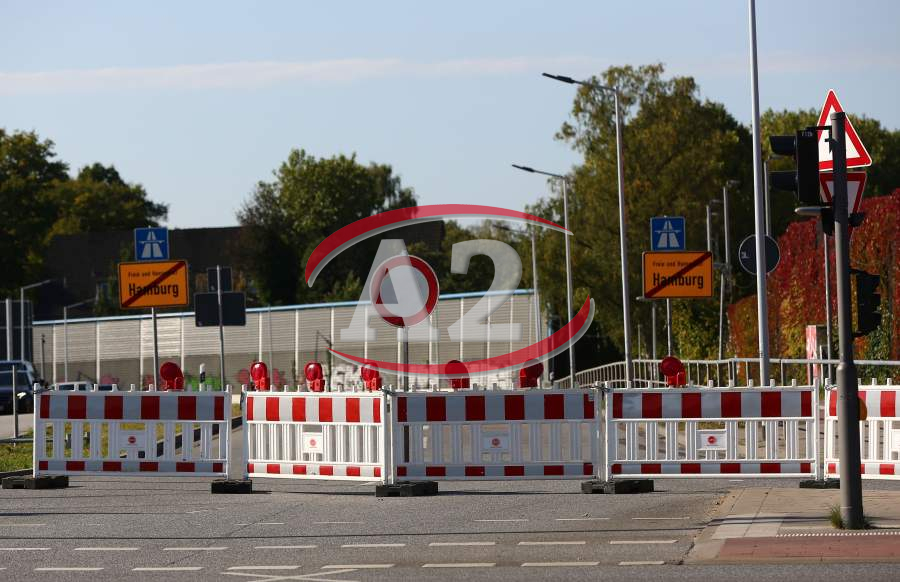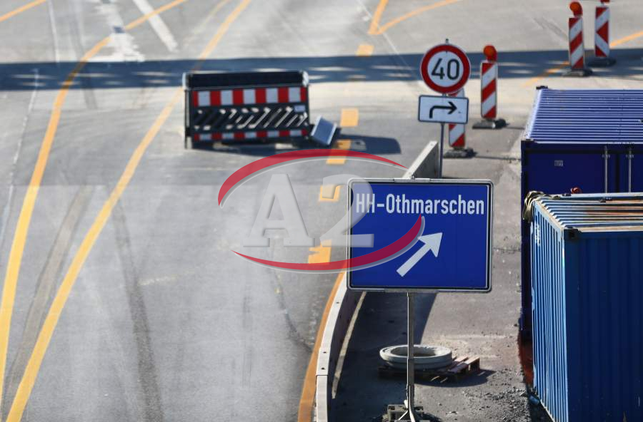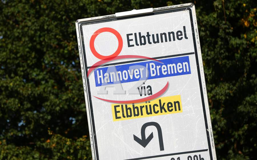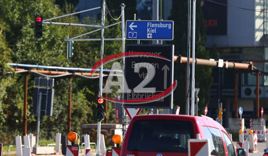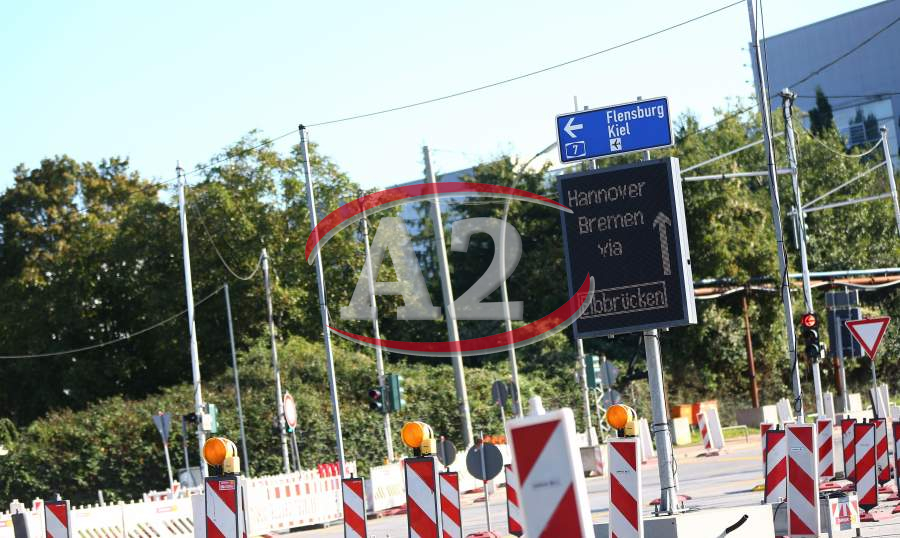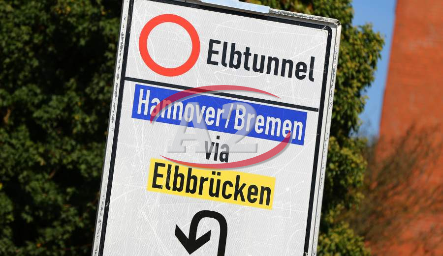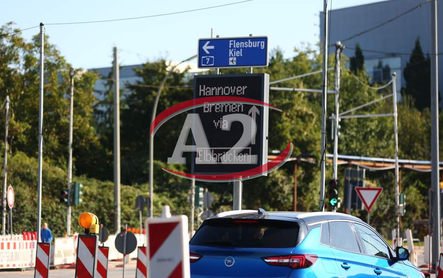 28.09.2025, xcex, GER, Hamburg, Autobahn, Traffic, A7, Elbtunnel, Bauarbeiten, Sperrung, Verkehr, Deckel, Baustelle, Schilder, Hannover, Bremen, der Elbtunnel auf der A7 ist zwischen Anschlussstelle HH-Stelligen und HH-Heimfeld wegen Bauarbeiten gesperrt, Strassenschild, Feuerwehrausfahrt, Symbolbild