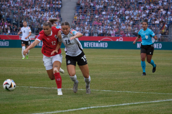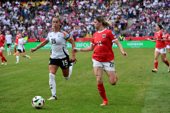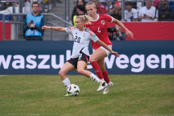 16.07.2024 xkhx Hannover Fussball European Qualifiers Frauen, Nationalmannschaft Deutschland - Österreich Klara Bühl (Deutschland, DFB, 19) und Laura Wienroither (Österreich, 12) ********* Foto: Peter Hartenfelser