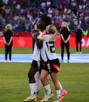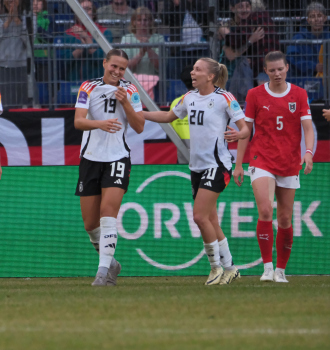 16.07.2024 xkhx Hannover Fussball European Qualifiers Frauen, Nationalmannschaft Deutschland - Österreich Schlussjubel bei Nicole Anyomi und Elisa Senß (Deutschland, ) ********* Foto: Peter Hartenfelser