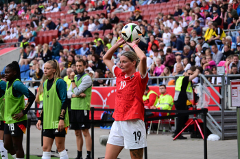 16.07.2024 xkhx Hannover Fussball European Qualifiers Frauen, Nationalmannschaft Deutschland - Österreich Verena Hanshaw (Österreich, 19) beim Einwurd ********* Foto: Peter Hartenfelser
