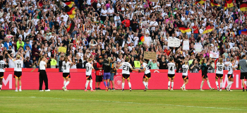 16.07.2024 xkhx Hannover Fussball European Qualifiers Frauen, Nationalmannschaft Deutschland - Österreich Schlussjubel nach dem Sieg der Deutschen Nationalmannschaft bei den Fans und der Mannschaft ********* Foto: Peter Hartenfelser