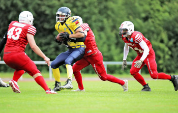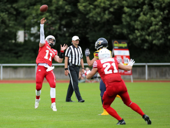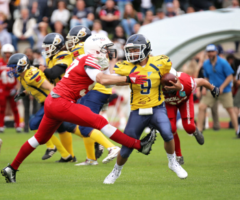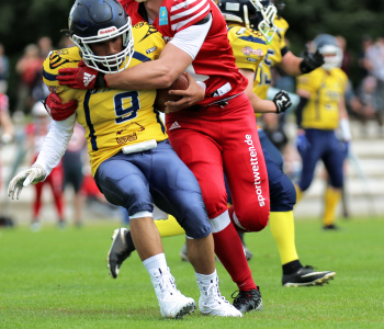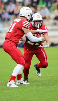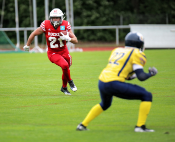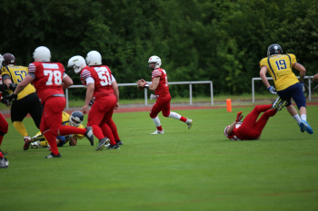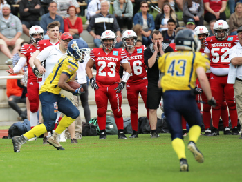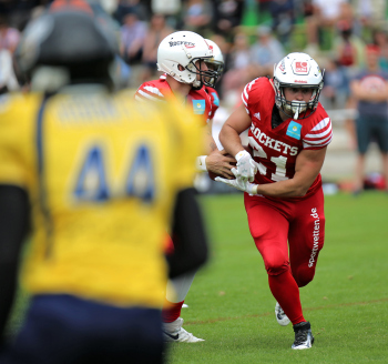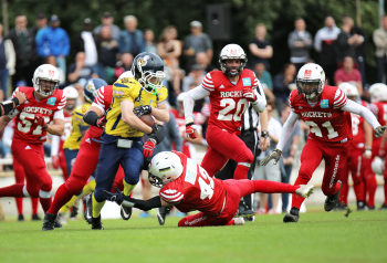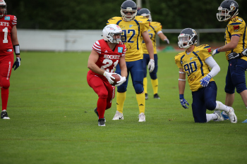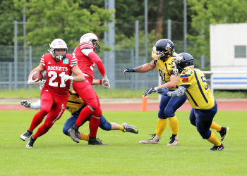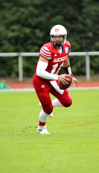 30.05.2019, xxx, American Football, Offenbach am Main, SANA Spportpark, Oberliga Hessen, Rhein-Main Rockets gegen Hanau Hornets; in rot Anton Dudin (Rhein-Main Rockets);