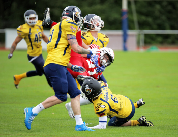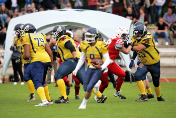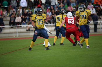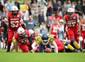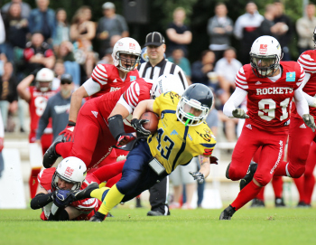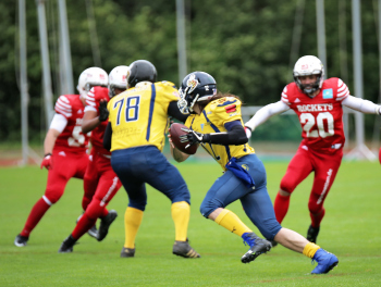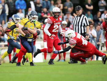 30.05.2019, xxx, American Football, Offenbach am Main, SANA Spportpark, Oberliga Hessen, Rhein-Main Rockets gegen Hanau Hornets; In der Mitte Anton Dudin (Rhein-Main Rockets);