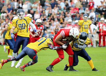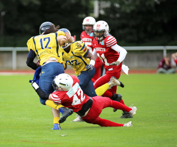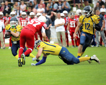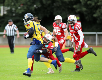 30.05.2019, xxx, American Football, Offenbach am Main, SANA Spportpark, Oberliga Hessen, Rhein-Main Rockets gegen Hanau Hornets; vl. Alexey Korokbov (Hanau Hornets); Maximilian Wolf (Rhein-Main Rockets); Leon Meissner (Hanau Hornets);