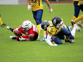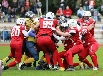 30.05.2019, xxx, American Football, Offenbach am Main, SANA Spportpark, Oberliga Hessen, Rhein-Main Rockets gegen Hanau Hornets; mit Ei Anton Dudin (Rhein-Main Rockets); rechts auf den Knien Melvin Hettrich (Hanau Hornets)