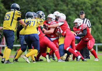 30.05.2019, xxx, American Football, Offenbach am Main, SANA Spportpark, Oberliga Hessen, Rhein-Main Rockets gegen Hanau Hornets; vl. In rot Anton Dudin (Rhein-Main Rockets); rechts Baibun Buennecke (Hanau Hornets);
