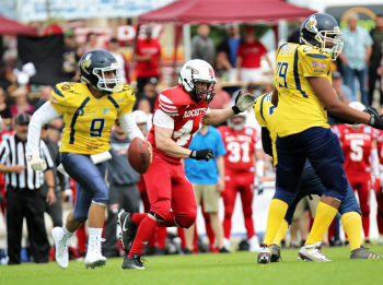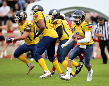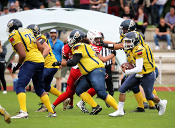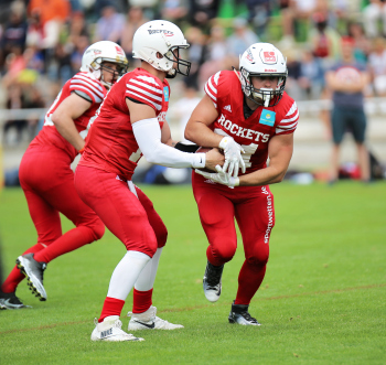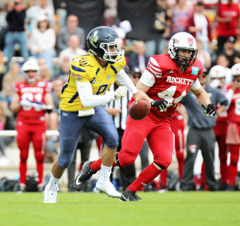 30.05.2019, xxx, American Football, Offenbach am Main, SANA Spportpark, Oberliga Hessen, Rhein-Main Rockets gegen Hanau Hornets; Mit dem Ei Jerome Drott (Rhein-Main Rockets);