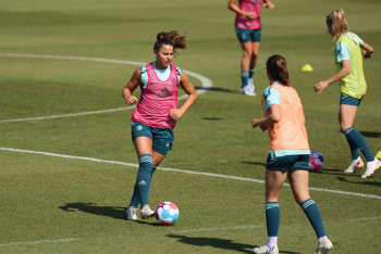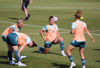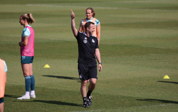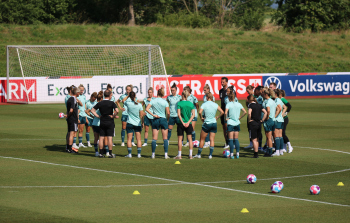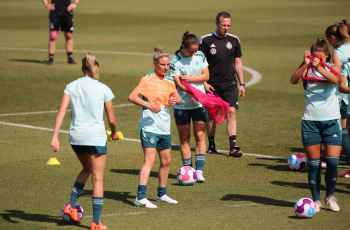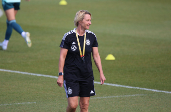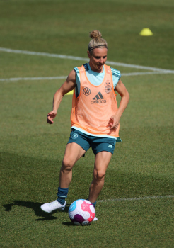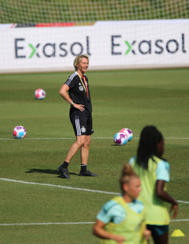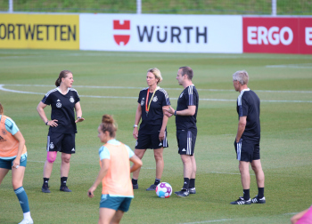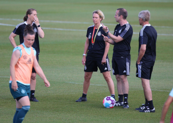 16.06.2022, xcex, GER, Herzogenaurach, Adi-Dassler-Stadion, Frauenfussball, Uefa EURO 2022, DFB Frauen, Vorbereitung, Herzo Base, Training DFB Frauen-Nationalmannschaft, Co-Trainerin Britta Carlson, Bundestrainerin Martina Voss-Tecklenburg, Co-Trainer Patrik Grolimund und Co-Trainer Thomas Noerenberg, Trainerteam