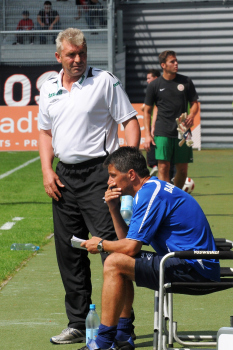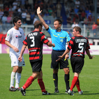 1.8.2010 3. Liga, Saison 2010/11, SV Wehen Wiesbaden - SV Babelsberg (Wehen rotschwarz, Babelsberg weiss), Schiedsrichter Marc Seemann ermahnt die Spieler v.l.n.r. Dominik Strohengel (Babelsberg) , Thorsten Barg und Nikolas Ledgerwood (Wehen)