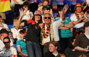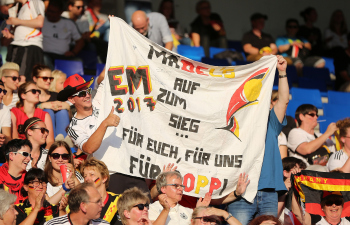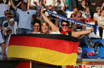deutsche Fans auf der Trib?ne feuern die deutsche Mannschaft an, Stimmung, Freude, Plakat, Fahne, Deutschland