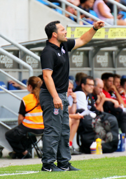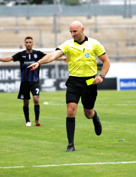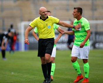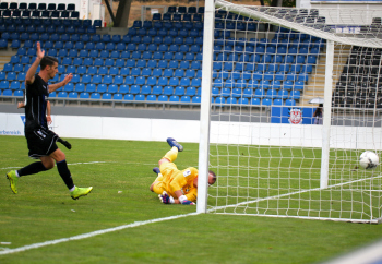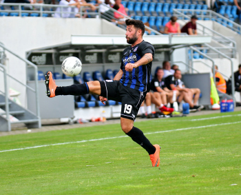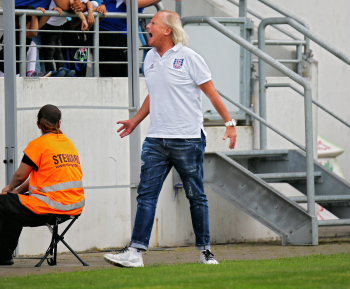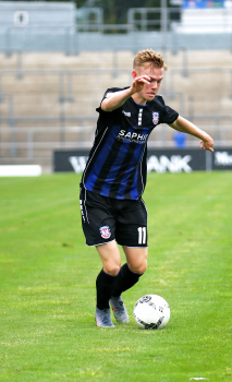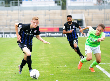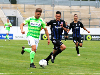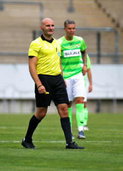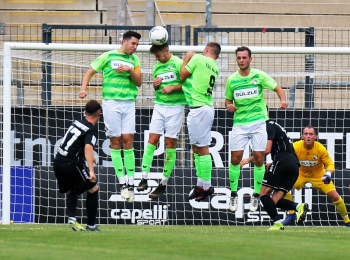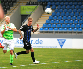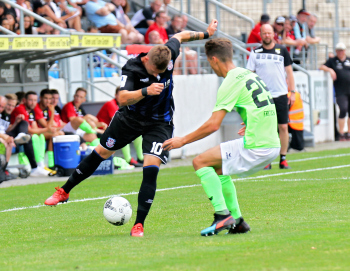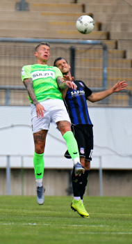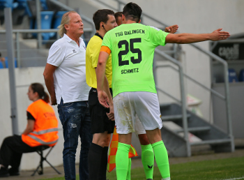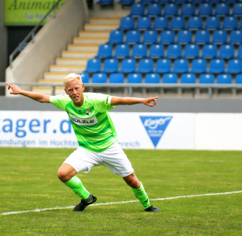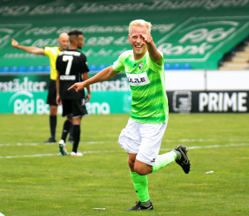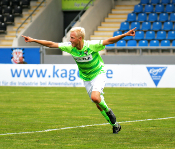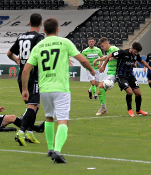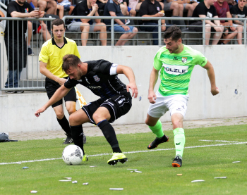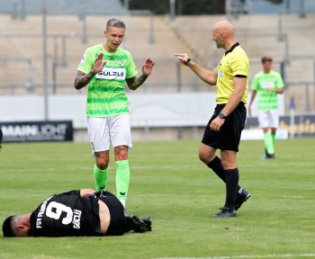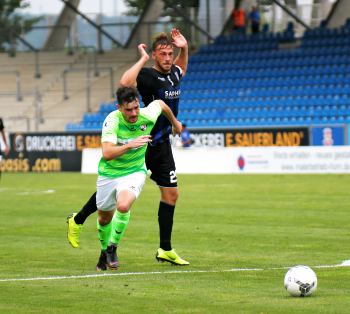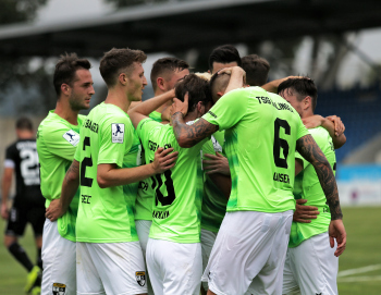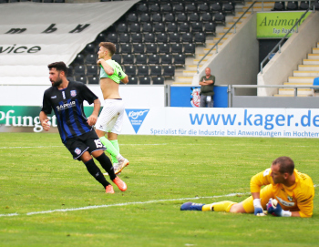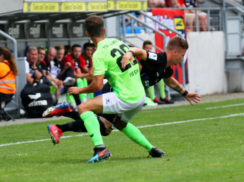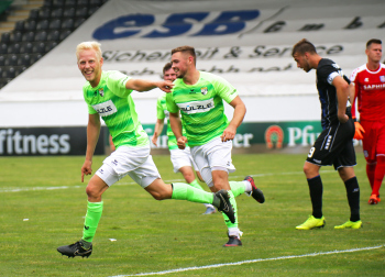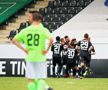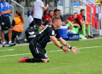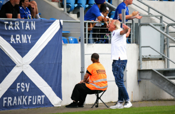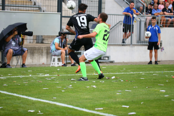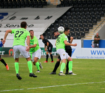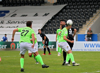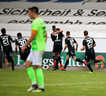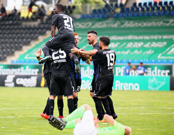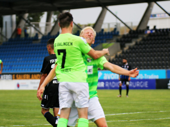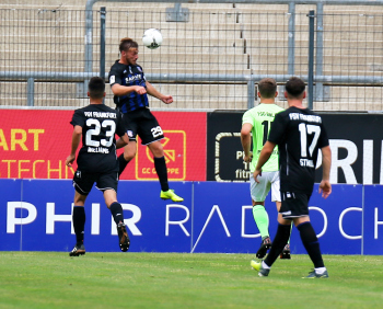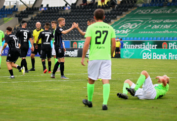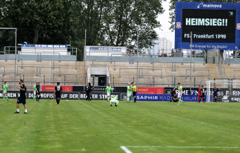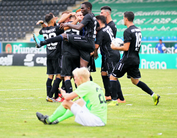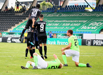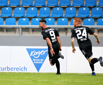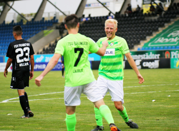 27.07.2019, xxx, Frankfurt, Fussball, PSD Arena, Regionalliga Suedwest, Saison 2019/2020, FSV Frankfurt gegen TSG Balingen; Tor zum 1:1 durch Dominik Nothnagel Kapitaen (FSV Frankfurt), in der 90+1 Minute Jubel von Nestor Djengoue (FSV Frankfurt), und Arif Gueclue (FSV Frankfurt), Enttaeuschung bei Fabian Kurth (TSG Balingen), und am Boden Lukas Foelsch (TSG Balingen),