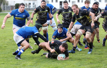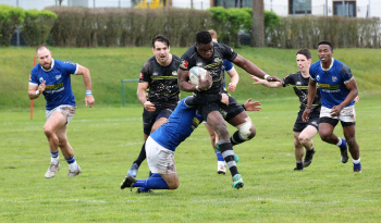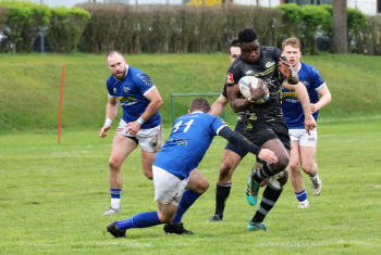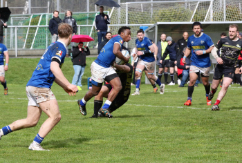 01.04.2023 xmgoodx Offenbach am Main Rugby Bundesliga Süd/West Offenbacher SCR (OSC Rosenhöhe) – SC Neuenheim Christian Holmes ( Rosenhöhe) gegen Harry Cartwright (11, Neuenheim) ***** Foto: A2Bildagentur Hartenfelser