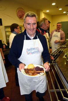 07.12.2016 Frankfurt, R?mer Weihnachtsgans-Essen f?r Obdachlose 2016 Ex-Fussballer Dieter M?ller serviert die Weihnachtsgans ********** Foto: Peter Hartenfelser