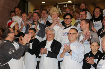 07.12.2016 Frankfurt, R?mer Weihnachtsgans-Essen f?r Obdachlose 2016 Eduard M. Singer Direktor Grandhotel Hessischer Hof mit seinen Jungs ********** Foto: Peter Hartenfelser