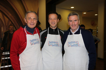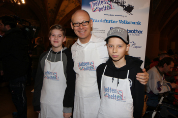 07.12.2016 Frankfurt, R?mer Weihnachtsgans-Essen f?r Obdachlose 2016 Karl-Heinz ?Charly? K?rbel, Fredi Bobic und Dieter M?ller mit den "helfen helfen" Sch?rtzen ********** Foto: Peter Hartenfelser