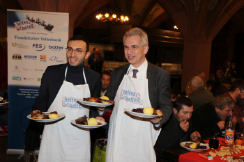 07.12.2016 Frankfurt, R?mer Weihnachtsgans-Essen f?r Obdachlose 2016 Mike Josef (SPD-Vorsitzender) mit Frankfurts Oberb?rgermeister Peter Heldmann ********** Foto: Peter Hartenfelser