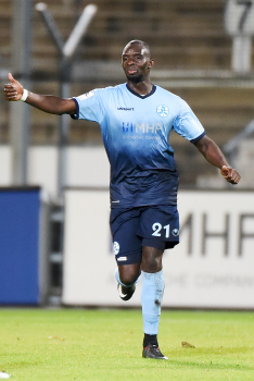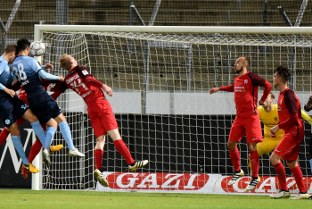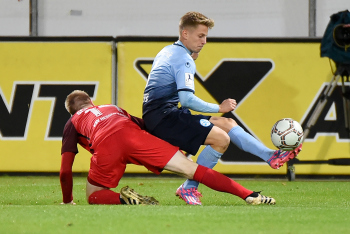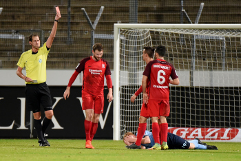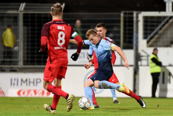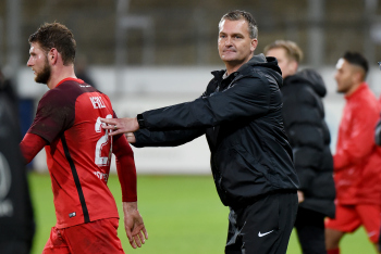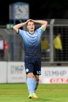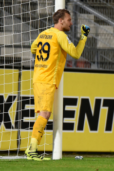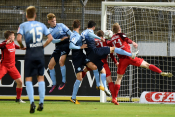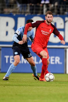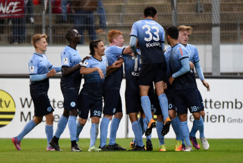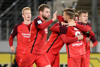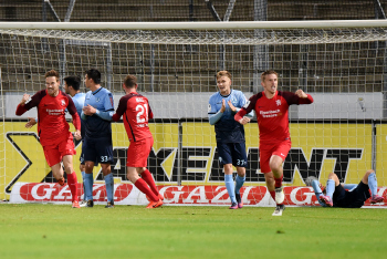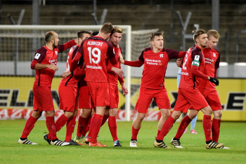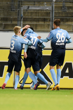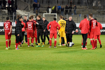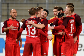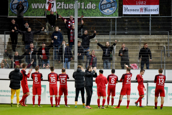 Torwart Valentin Kliebe (KSV Hessen Kassel), Lucas Albrecht (KSV Hessen Kassel), Frederic Brill (KSV Hessen Kassel), Steven Rakk (KSV Hessen Kassel), Sergej Evljuskin (KSV Hessen Kassel), Adrian Bravo Sanchez (KSV Hessen Kassel), Ingmar Merle (KSV Hessen Kassel), Sergej Schmik (KSV Hessen Kassel) feiern mit Ihren Fans.