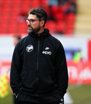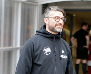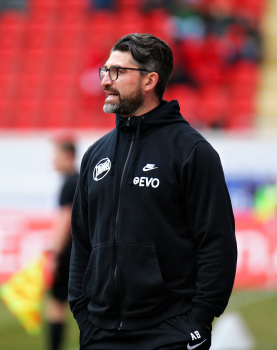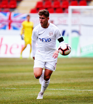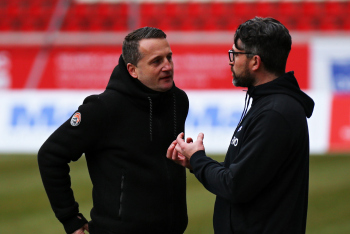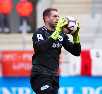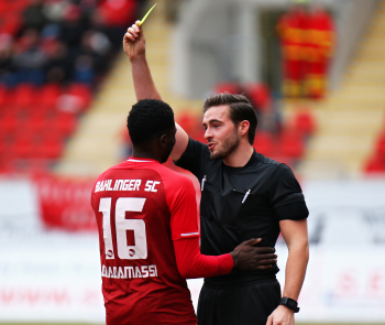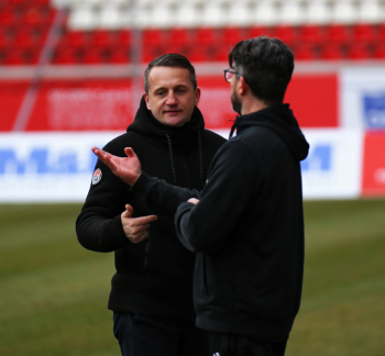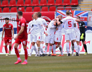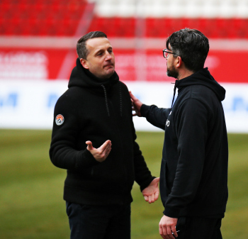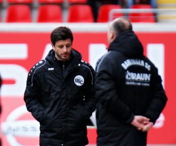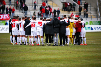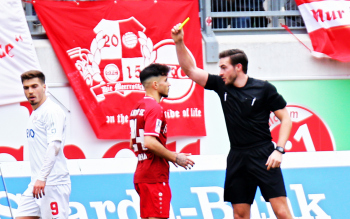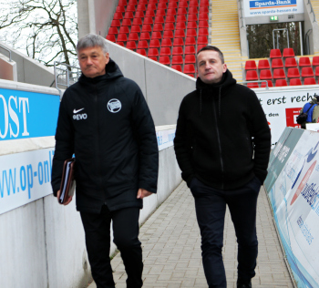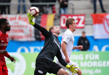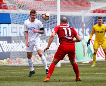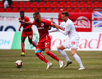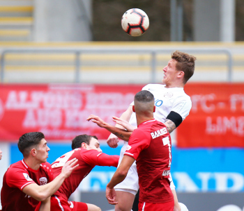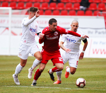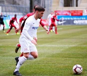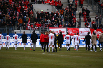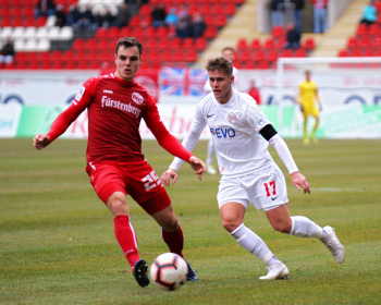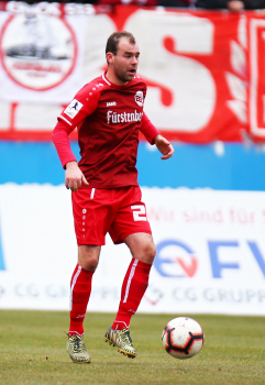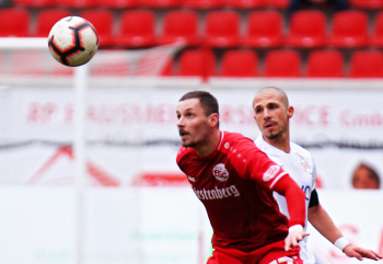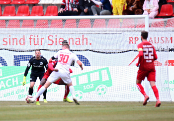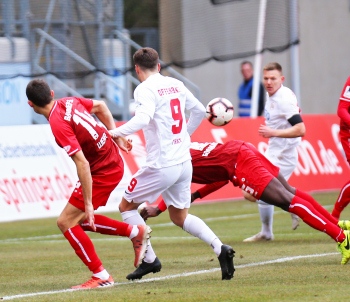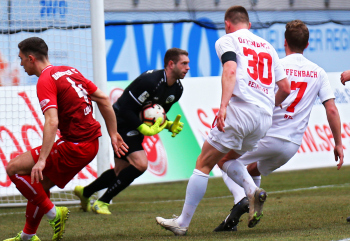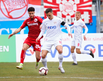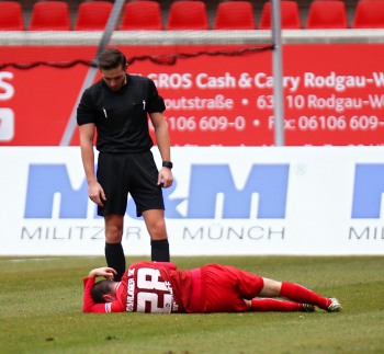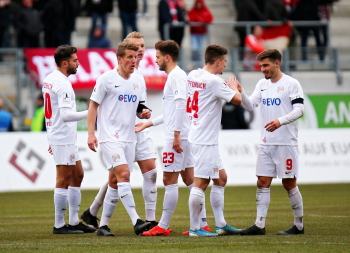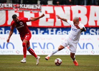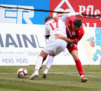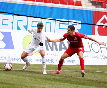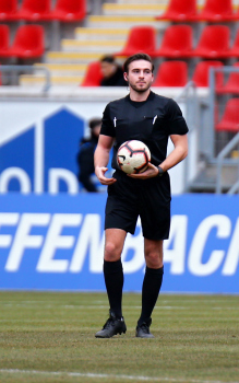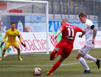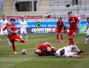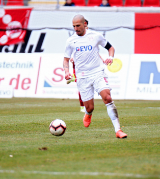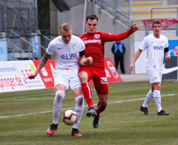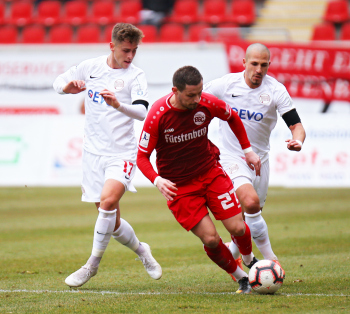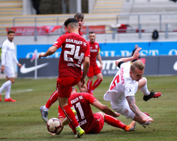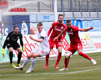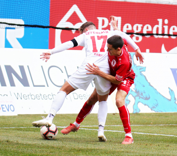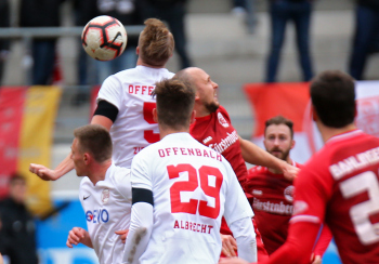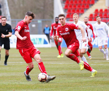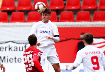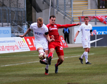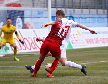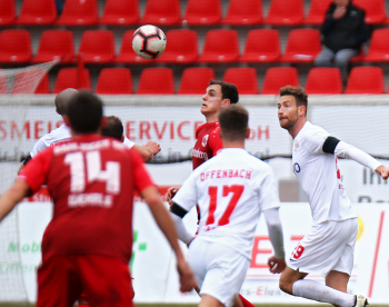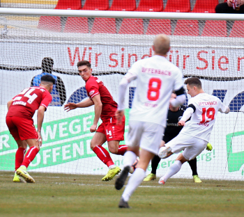 22.02.2020, xxx, Fussball, Offenbach am Main, Sparda-Bank-Hessen Stadion,  Regionalliga Suedwest,  Saison 2019/2020, Kickers Offenbach (OFC) gegen Bahlinger SC;  linkd Luka Garic (Kickers Offenbach); , in rot Hasan Pepic (Bahlinger SC);  rechts Luigi Campagna (Kickers Offenbach);